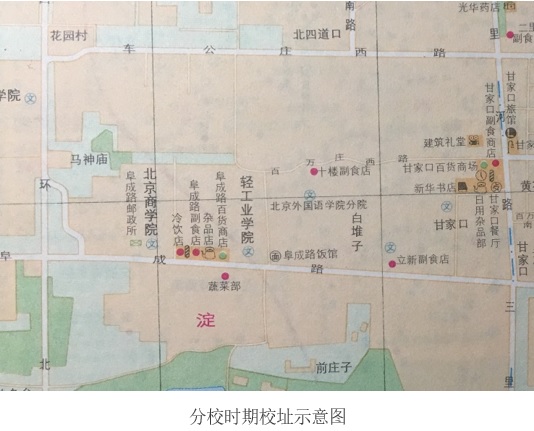 位于阜成路白堆子的原北京外国语学校校址,在上世纪五十年代曾是北京市工农干校的办学地点。1960年,北京市成立的北京外国语学校接管了北京市工农干校的校舍,并沿用原有建筑办学。1981年北京外国语学院分院迁入阜成路白堆子后,分院的图书馆、电教室、办公楼、学生宿舍楼、礼堂、平房教室及四合院等使用的都是原北京市工农干校的旧建设,总建筑面积共约2万平方米,这是分院办学的建筑主体。1980年三校合并成立新的北京外国语学院分院后,在该校址处开始建设教工宿舍楼和操场。1982年国庆前夕,分院新建的1、2、3号教职工宿舍楼峻工。