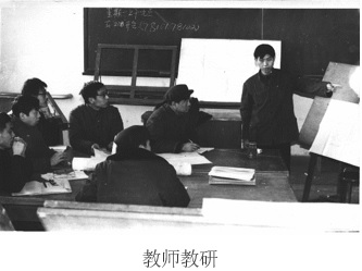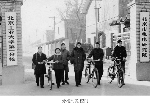 二个月的筹建时间对于创办高等院校来说毕竟很短,当时的条件十分有限,用“艰苦”两字来形容建校初期的情况很是恰如其分。工大一分校坐落在市机电研究院内,部门多,环境杂、噪音大。办学使用的教学楼是与市机电研究院共用的,临时拼凑了一些房间作为教室和办公室,学生上课的教室与市机电研究院的车间、检验室、图书馆、娱乐室、技校等交叉分布在这座楼里。这座楼是原北京工业学校的一座教学主楼,由前苏联建造,供暖设施不太完善,冬天的时候很冷,师生们上课要忍受冬日的寒风。为了多腾出教室办学,校领导和两名系主任共用一间办公室,全校两个系和基础部的教师们挤在地下室一个稍大些的房间里。筹备实验室是在楼前的工棚里办公,夏季战酷暑、冬季战严寒,其他行政科室也都是同样的工作条件,大家都咬着牙坚持办公。张广华老师当时曾打趣地说:“咱们这是在螺丝壳子里作道场!”除此之外,教学设备和实验设备也不足,教师缺乏。基础课程教学主要依靠每班配备2台17寸黑白电视开展电视教学,只有专业课程有助教老师可以帮助学生解决一些学习上的问题、讲解习题。分校操场面积较小,几乎没有什么体育设备,操场内只有两个篮球框。打篮球是当时很多学生体育娱乐的方式。尽管如此,师生们并没有被当时的困难吓倒,从领导到教职工的干劲丝毫没有受到影响,大家都非常珍视这来之不易的复校机会,“恢复高考,早出人才”已经不是什么空洞的口号,它们就像战斗的号角一般呼之欲出,不停地激励大家努力工作,奋发图强。学生们格外珍惜这来之不易的学习机会,充分利用一切时间刻苦学习,大部分学生每天晚上都要在教室学习到晚上九点以后,大家在教室看书、写作业、讨论解决学习过程中遇到的问题,学习氛围十分浓厚。在完成自己学习的前提下,学生们还参加分校组织的义务劳动,擦玻璃、打扫楼道、打扫厕所等,帮助解决分校人员有限的困难。