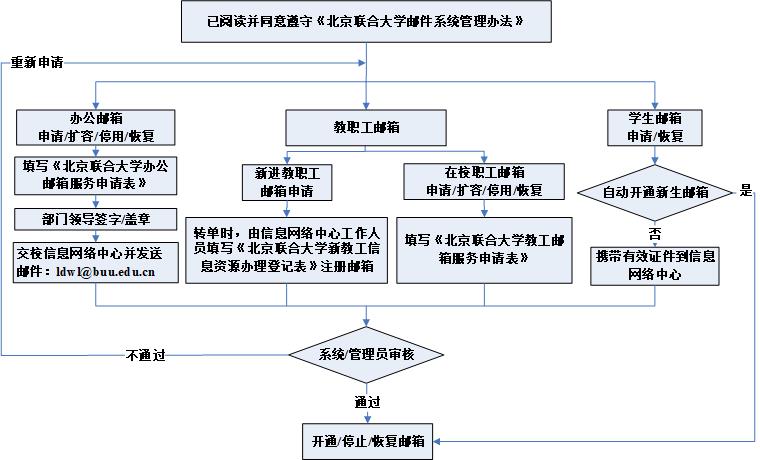新进教职工在办理入校转单至信息网络中心时,自动注册邮箱;在校教职工邮箱的申请与扩容需填写《北京联合大学教工邮箱服务申请表》,默认容量6G;