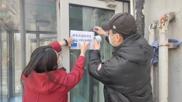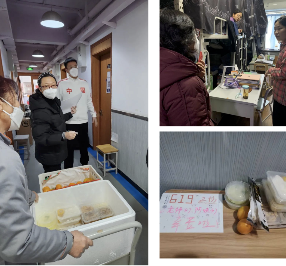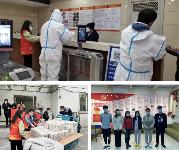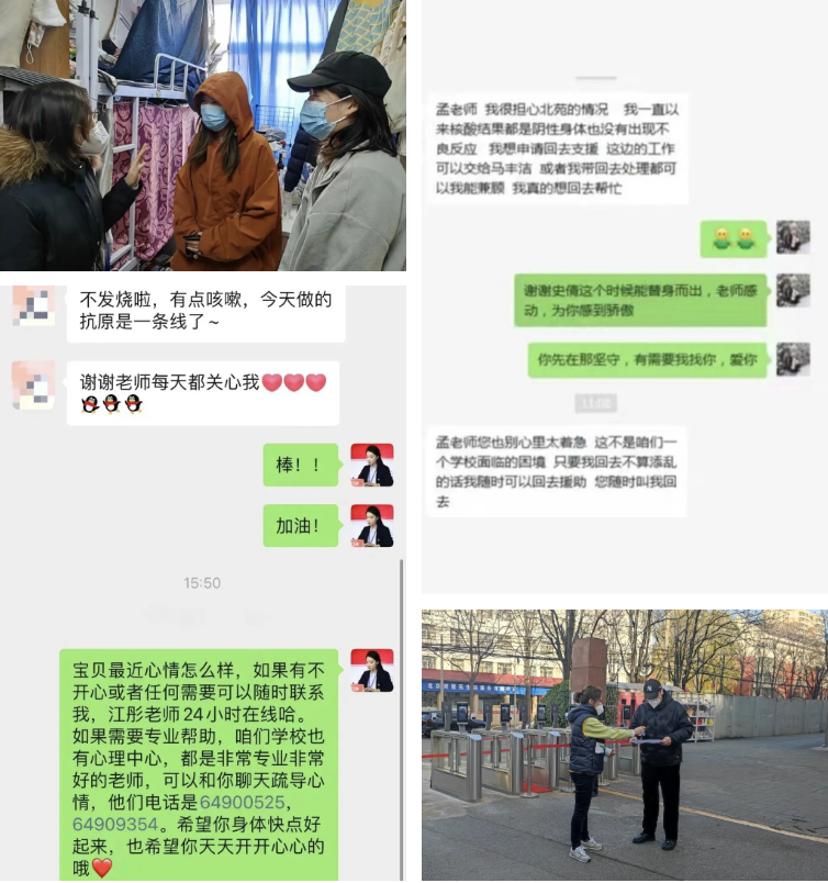 学工办主任寇蕴已经连日住在学院值守,第一时间赶赴现场。辅导员赵磊来不及安顿好家中生病的老人和需要照顾的小孩,就赶回学院,发布公众号推送、制作暖心视频、排查学生舆情;李爽刚到达北五环外的家中,就又背起行囊回到校园,两小时内穿行北京“16环”后,立刻投入工作;王昕到达学院后直奔宿舍,不断地打着手语与学生交流,解决学生困惑,安抚焦虑的学生;梁辉老师抛下正上小学的儿子,身体不适到医院完成检查后火速投入到值班一线,傅子健周五刚回到怀柔家中,听说校区有阳性病例后,毫不犹豫地说,“需要的话我马上赶回学院,时刻准备好等待调遣通知。”