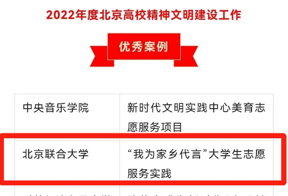 经推荐报送和专家评审等程序,近日,我校“我为家乡代言”大学生志愿服务实践活动获评2022年度北京高校精神文明建设工作优秀案例。