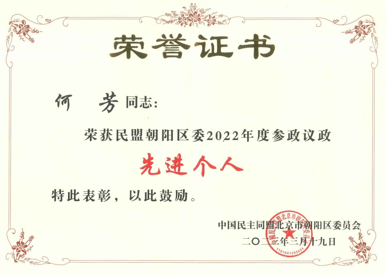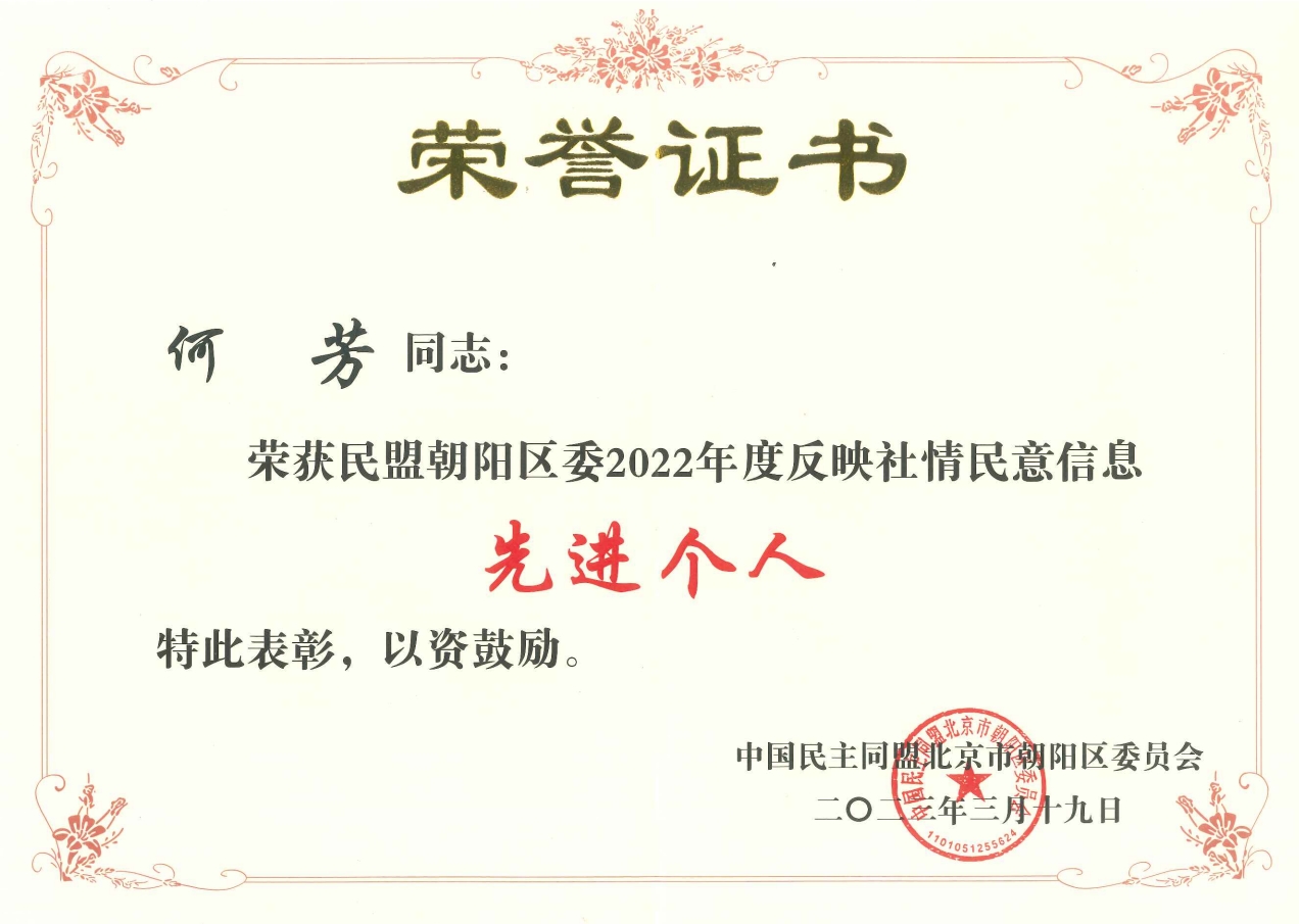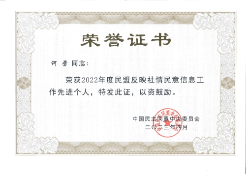 为表彰先进、宣传典型,民盟中央对在2022年度反映社情民意信息工作中作出突出贡献的个人予以表彰。我校外语部教授何芳荣获民盟中央“2022年度民盟反映社情民意信息工作先进个人”荣誉称号,荣获民盟朝阳区委“2022年度反映社情民意信息先进个人”“2022年度参政议政先进个人”荣誉称号。