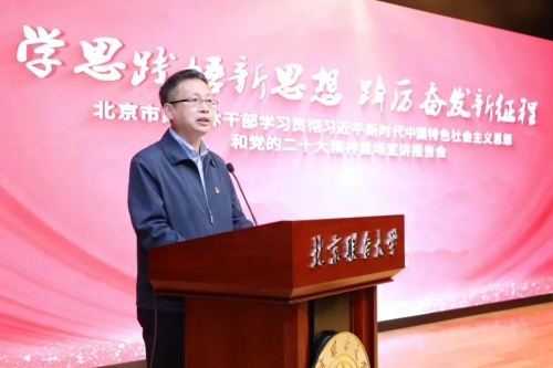 为深入学习宣传贯彻党的二十大精神,认真落实中央和市委关于学习贯彻习近平新时代中国特色社会主义思想主题教育的部署要求,组织全市离退休干部持续深化“增添正能量·共筑中国梦”主题活动,5月9日下午,北京市委老干部局和北京市委教育工委在我校共同举办北京市离退休干部学习贯彻习近平新时代中国特色社会主义思想和党的二十大精神宣讲团成立仪式暨“学思践悟新思想 踔厉奋发新征程”主题宣讲首场报告会,充分发挥老干部政治强、觉悟高、党性好的独特优势,为推动党的创新理论深入人心加油助力,唱响礼赞新时代、奋进新征程的昂扬旋律。市委组织部副部长、市委老干部局局长张彤军出席并讲话,市委教育工委二级巡视员韩宝来出席并致辞,市委主题教育第一巡回指导组联络员刘贤才、组员张晓宇到场指导本次活动。我校党委书记楚国清、党委副书记王爱军出席报告会。报告会由市委老干部局副局长于甲川主持。