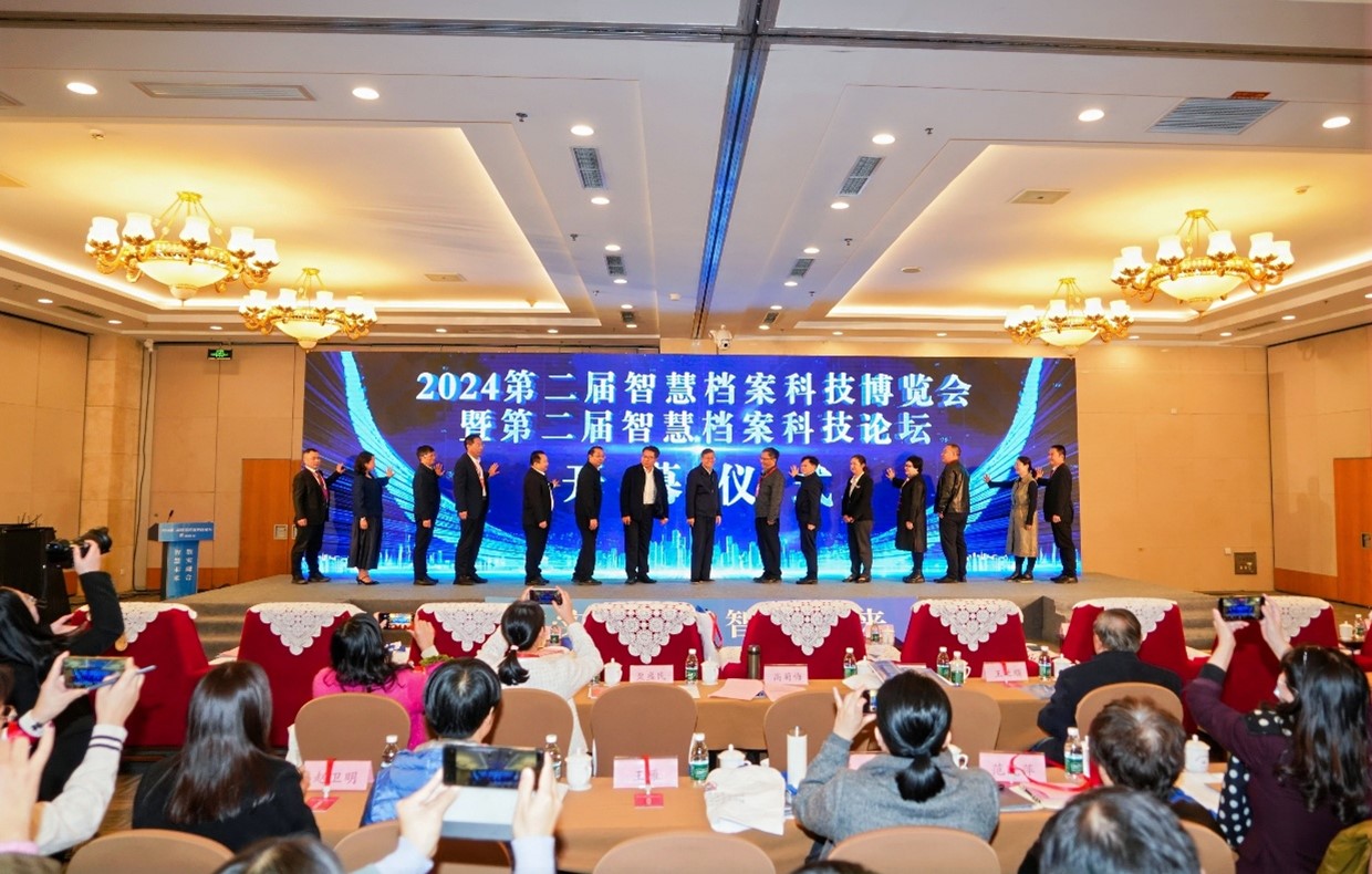 开幕式上,与会嘉宾共同为2024第二届智慧档案科技博览会暨第二届智慧档案科技论坛揭幕。