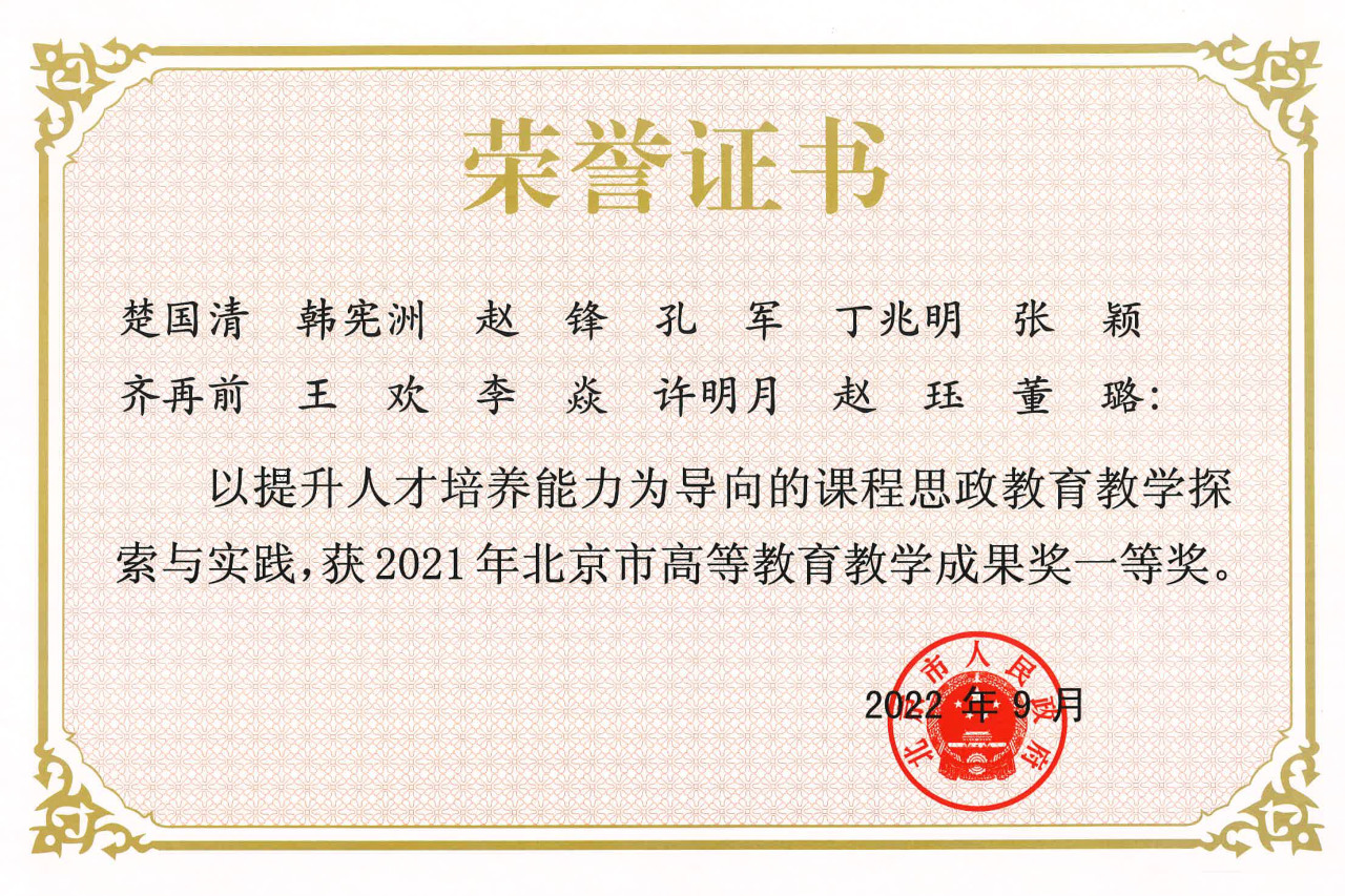 2022年,《以提升人才培养能力为导向的课程思政教育教学探索与实践》荣获北京市教育教学成果奖一等奖。