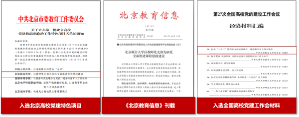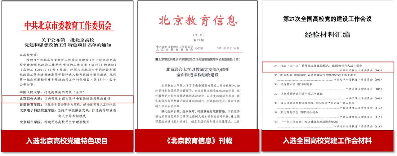 “以教师党支部为依托 全面推进课程思政建设”入选第一批北京高校党建和思想政治工作特色项目,做法被《北京教育信息》刊发。“打造‘三个三’教师党支部建设模式 建强教书育人坚强战斗堡垒”入选第27次全国高校党的建设工作会议经验交流材料。