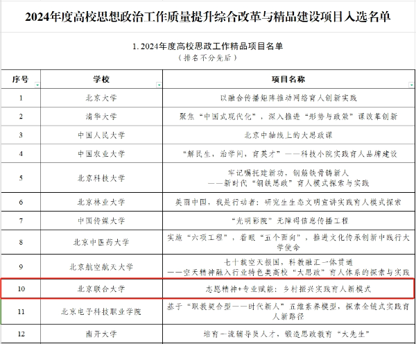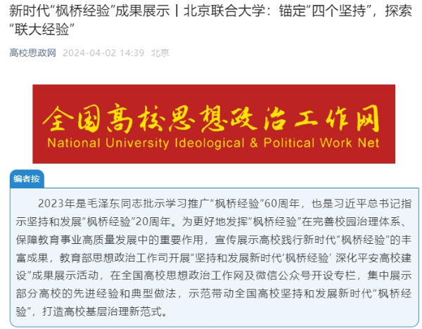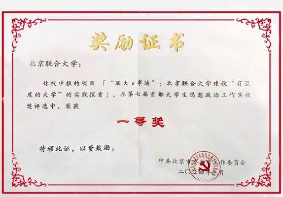 2022年,《沿着新时代足迹 争做新时代优秀青年》获评北京高校党的建设和思想政治工作优秀成果三等奖。“以‘梦想中国’为统领,培根铸魂,推动习近平新时代中国特色社会主义思想往深里走、往实里走、往心里走”项目获第六届首都大学生思想政治教育工作实效奖二等奖。《联大e事通:北京联合大学建设“有温度的大学”的实践探索》获评第七届首都大学生思想政治工作实效奖一等奖。