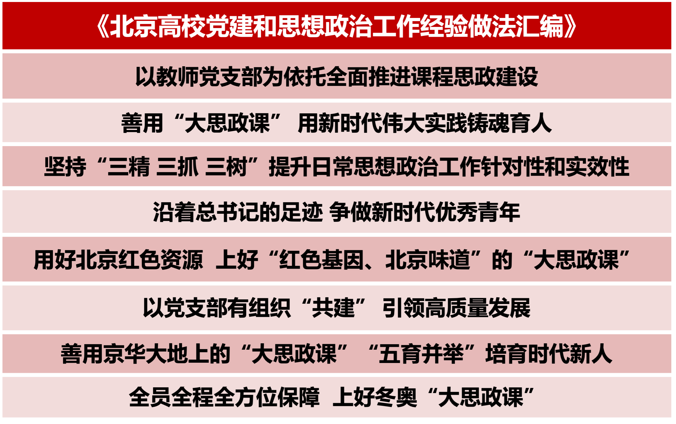 近三年来,《以教师党支部为依托全面推进课程思政建设》等8个案例入选《北京高校党建和思想政治工作经验做法汇编》。