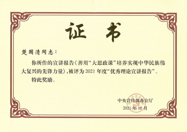 2021年,校党委书记楚国清《善用“大思政课”培养实现中华民族伟大复兴的先锋力量》宣讲报告获中宣部“优秀理论宣讲报告”表彰。