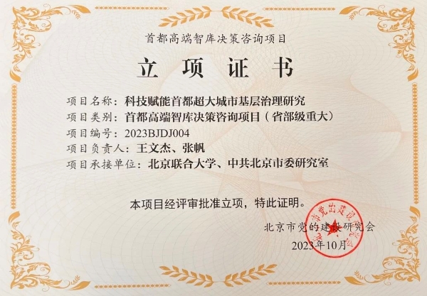《科技赋能首都超大城市基层治理研究》获批北京市党的建设研究会2023年度重大课题立项。